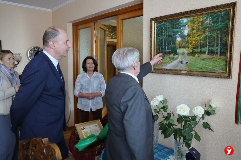 — Вся ваша трудовая деятельность, жизненный путь посвящён нашей стране, белорусскому народу. Вы — пример партийного государственного деятеля. Мы гордимся, что вы являетесь членом Совета старейшин при Минском облисполкоме — и для меня большая честь вручить вам высокую награду, Почётную грамоту Миноблисполкома за многолетнюю активную общественно-политическую деятельность, — подчеркнул Алексей Кушнаренко. — Мира, добра, с глубоким уважением к вам.