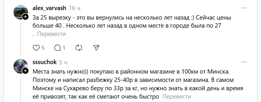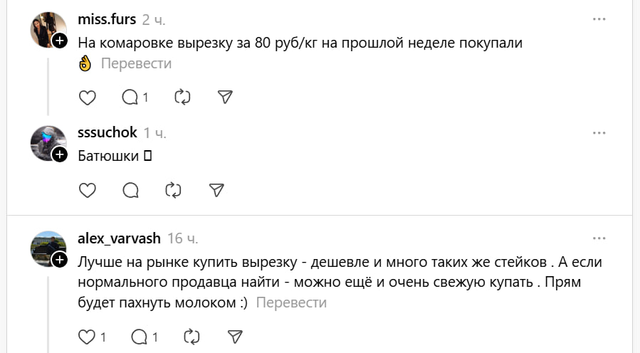 Но ему быстро указали на несоответствие реалиям: «За 25 вырезку — это вы вернулись на несколько лет назад 🙂 Сейчас цены больше 40».