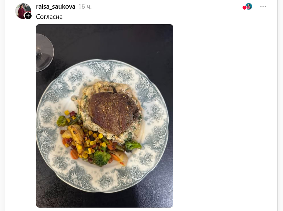 «Это просто бомбически нежная, сочная, тает во рту говяжья вырезка. 200 г один стейк вышел 13 BYN. Я буду за ним охотиться теперь», — написала она. «Я тоже буду после такого отзыва. Будем драться, значит», — отшутилась одна из пользовательниц. Под постом даже появилось фото-подтверждение от другой девушки, кратко подписавшей его: «Согласна».