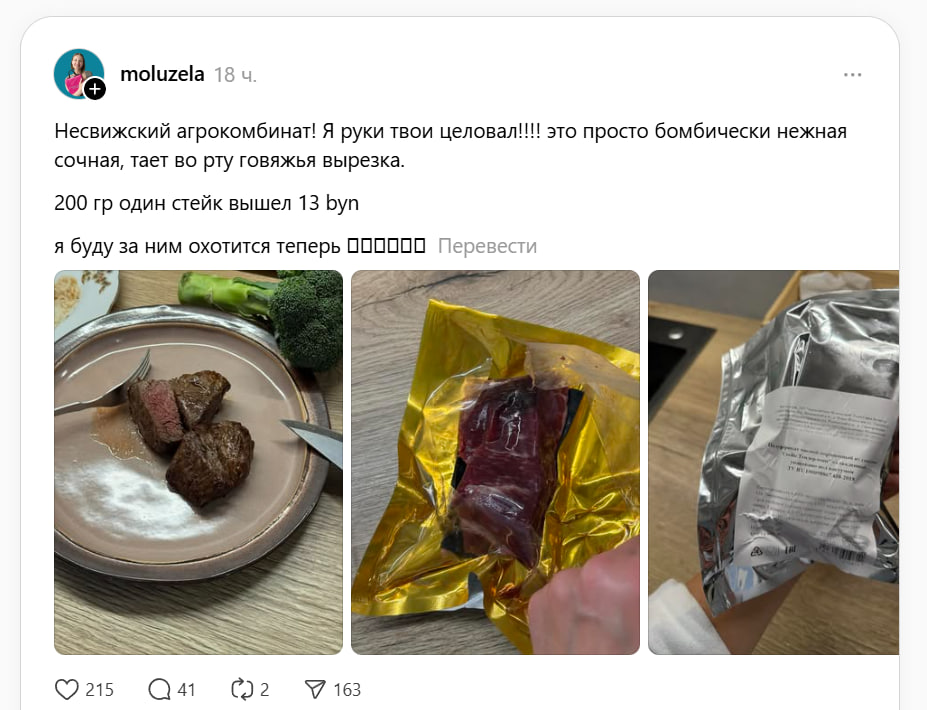 Так, пользовательница в эмоциональном порыве призналась в любви к говяжьей вырезке от «Несвижского агрокомбината».