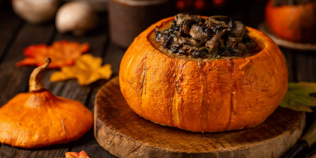 Это блюдо — не просто еда, это настоящее кулинарное представление. Целая тыква, наполненная ароматной начинкой из грибов, шпината и сыра, станет главным украшением осеннего стола. Она сочетает в себе сладость запеченной мякоти, насыщенный вкус грибной начинки и невероятный согревающий аромат.