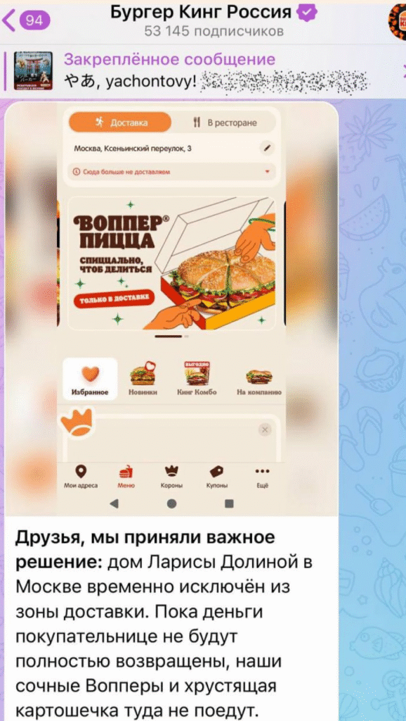 Свое слово сказала и сеть «Бургер Кинг» временно исключив ее из зоны доставки. В Telegram-канале бренда заявили, что пока деньги покупательнице квартиры не будут возвращены, «сочные бургеры и хрустящая картошка» туда не поедут. «Жестко? Возможно. Но справедливо», — отметили представители сети.