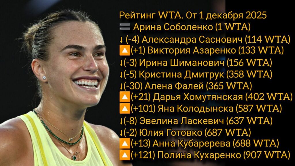 Так, на 1 декабря 2025 года Арина Соболенко продолжает возглавлять тотал. На счету примы 10870 очков. Следующей из наших является Александра Саснович. Она потеряла 4 строчки и опустилась на 114 место. Несмотря на то, что Виктория Азаренко уже долгое время не выступает, она поднялась на одну позицию вверх и теперь 133-я. Ирина Шиманович в свою очередь трех соперниц выпустила вперед и переместилась на 156-ю позицию. Кристина Дмитрук тоже оступается на 5 мест. Она уже 358-я. Алена Фалей минус 30 строк — 365-я. Дарья Хомутянская уверенно шагает вперед по рейтингу и поднимается еще на 21 место (402-я). Яна Колодынска плюс 101 строчка и 587-я в мировом тотале. Эвелина Ласкевич теряет 8 и опускается на 637-ю строку. Юлия Готовко 687-я (-2), Анна Кубарева — 688 (+13). Полина Кухаренко — 907-я (+121).