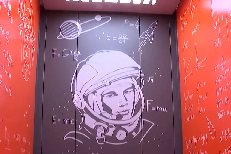 Его главная «фишка» — тематический дизайн. Кабину лифта украшают математические формулы и изображение Юрия Гагарина.