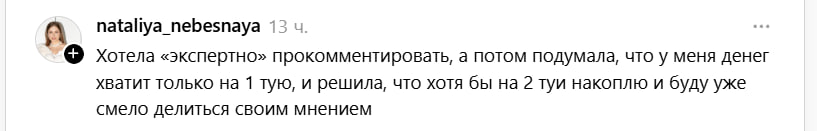 «Хотела «экспертно» прокомментировать, а потом подумала, что у меня денег хватит только на 1 тую, и решила, что хотя бы на 2 туи накоплю и буду уже смело делиться своим мнением», — написала одна из пользовательниц.