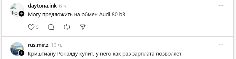 Другие предложили более творческие варианты сделки: «Могу предложить на обмен Audi 80 b3». А кто-то и вовсе предположил, что покупателем мог бы стать Криштиану Роналду, «у него как раз зарплата позволяет».