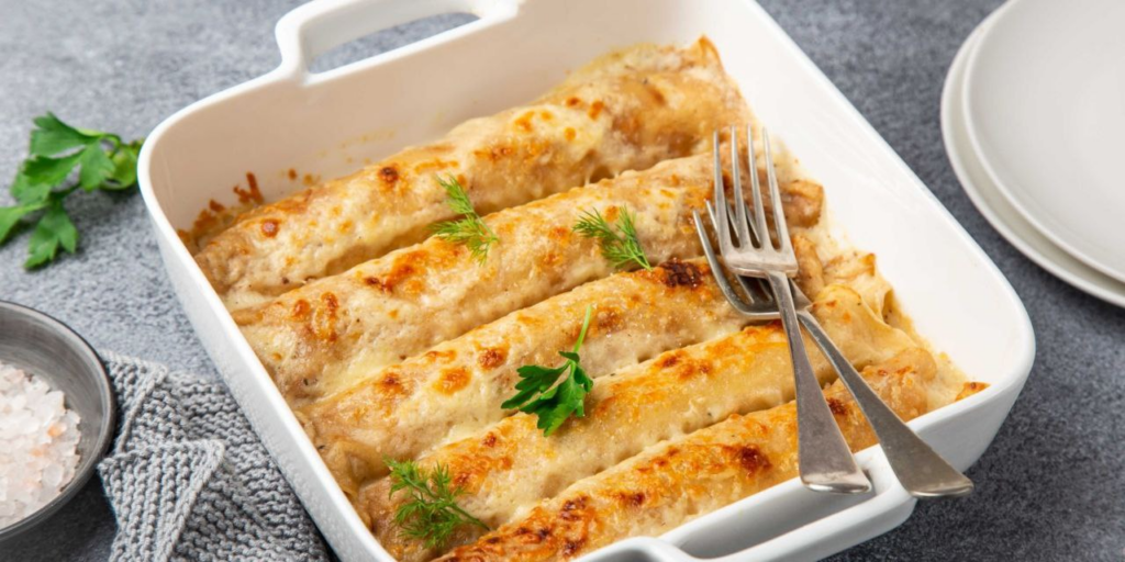 - На каждый блин выложите порцию начинки, сверните плотным рулетом. Уложите рулеты в смазанную маслом форму для запекания.