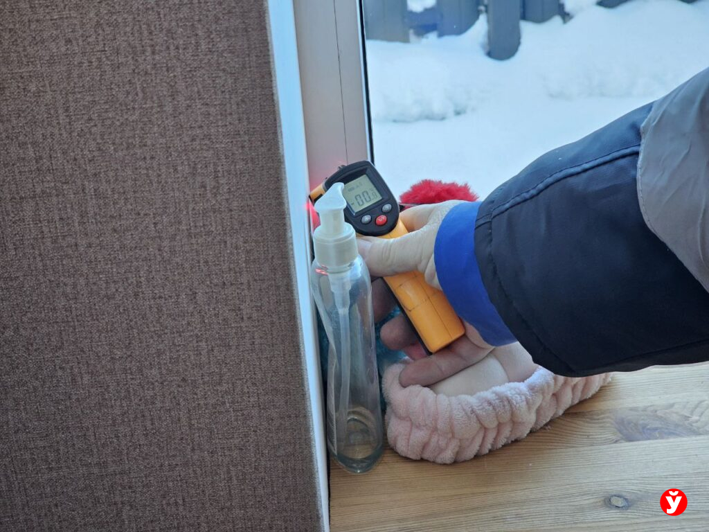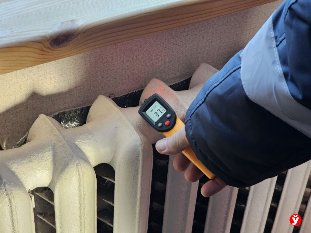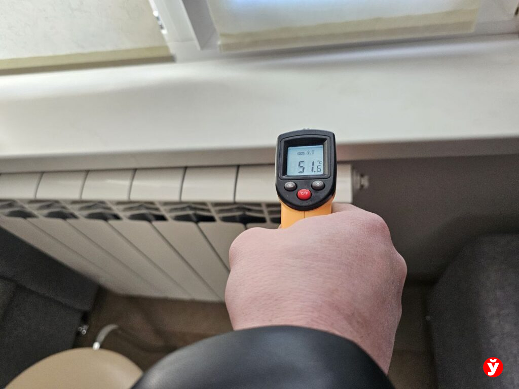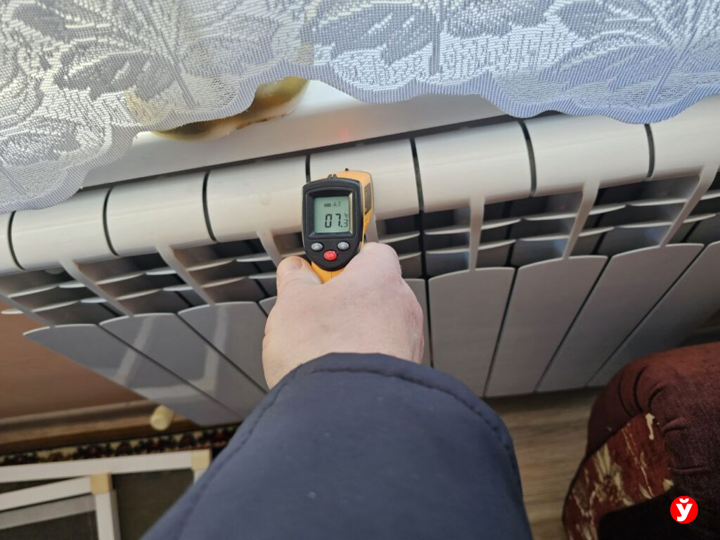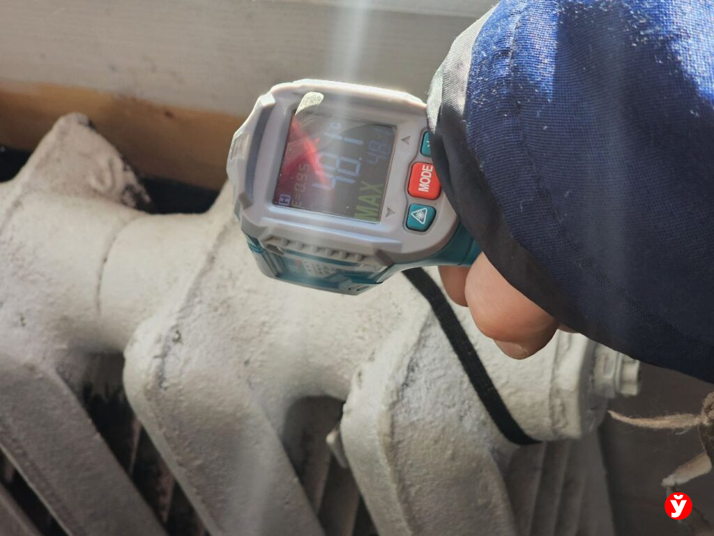 Специалисты в каждой комнате щёлкают пирометром. Цифры говорят красноречивее слов: на поверхности одной батареи — 66°C, на другой в этой же комнате — всего 7. Воздух прогрелся до 9 градусов.
