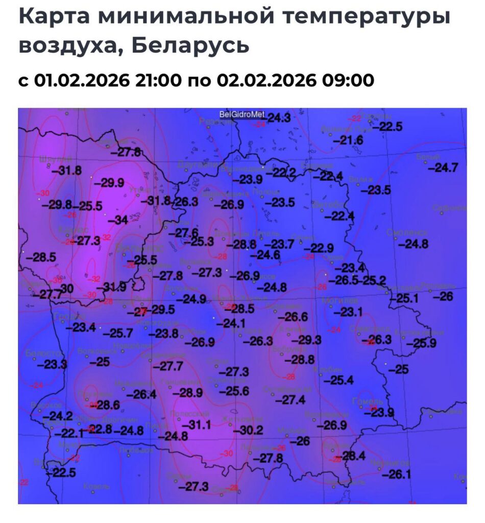 - Центральные районы (Минск и окрестности) держались на уровне -25…-28°C.