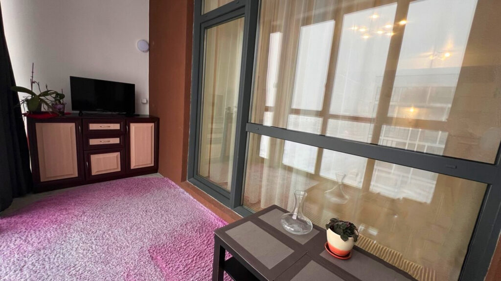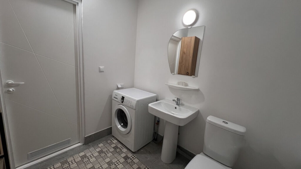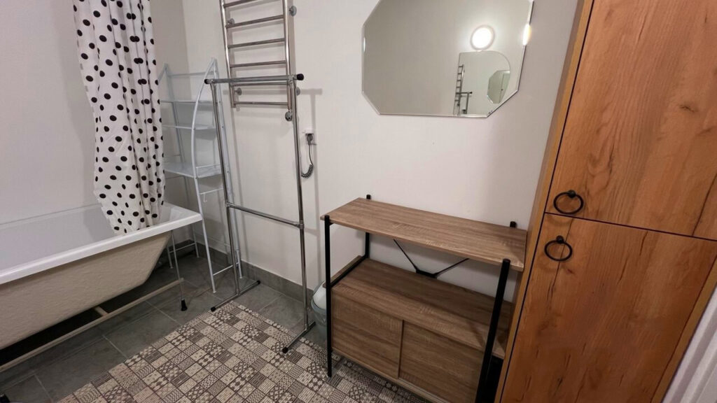 Отдельно стоит отметить просторную лоджию, которая была оформлена как полноценное место для отдыха. Здесь есть диванчик, столик и еще один телевизор. В ванной комнате, площадь которой составляет 6,4 квадратных метра, также все готово к заселению — установлены необходимые сантехнические приборы и выполнена отделка.