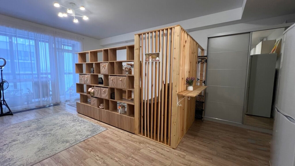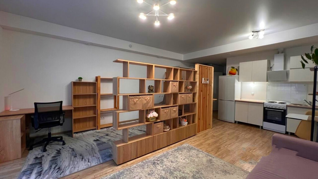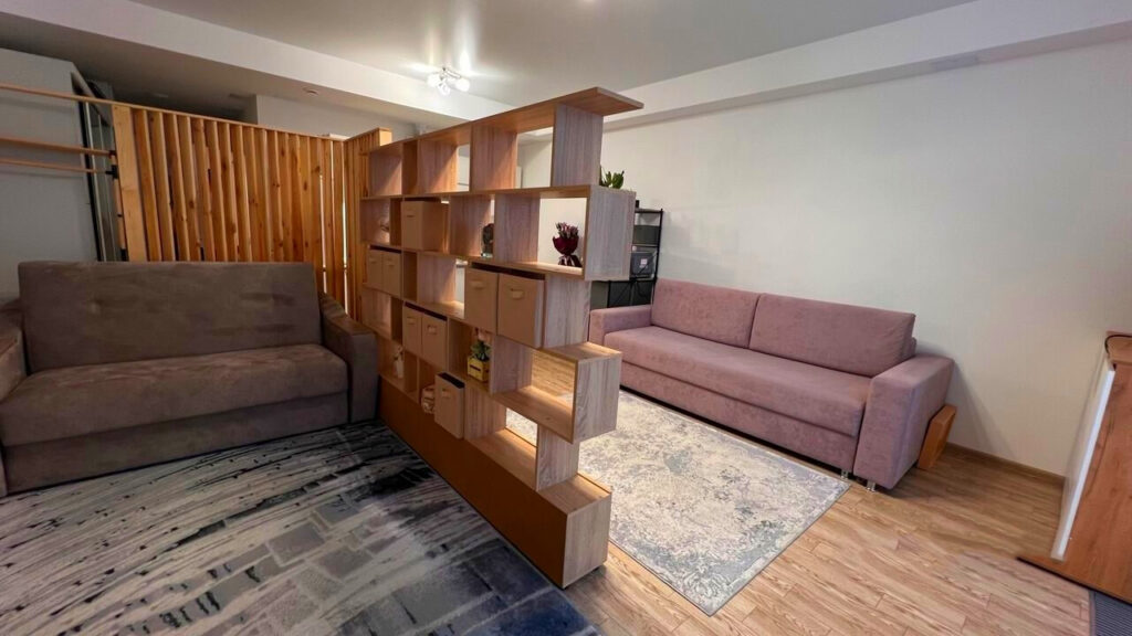 В уютной гостиной, которая плавно переходит в спальню, размещены диван и телевизор. Между зоной кухни и приватной частью квартиры, где расположено еще одно спальное место, установлены деревянные стеллажи, которые служат перегородкой и добавляют элемент стиля.