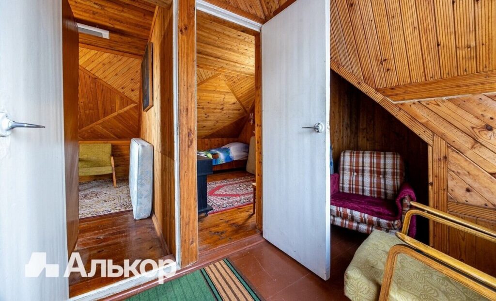 На втором этаже располагаются две уютные спальни. Комнаты оформлены в оригинальном стиле с деревянной отделкой и скошенными потолками. Светлые шторы, мягкие ковры и теплое освещение создают идеальные условия для любителей ретро-дизайна.