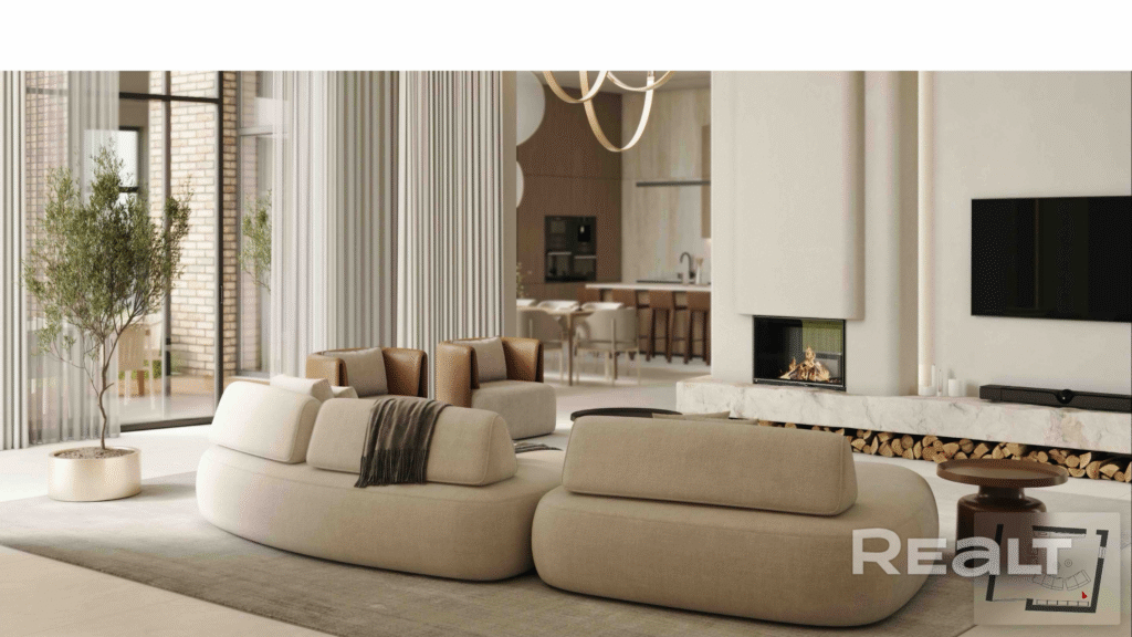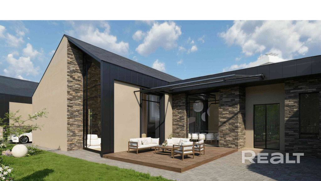 Здесь предусмотрены камин и сауна, а в отдельных зонах потолки достигают 7 метров. Сам участок площадью 7 соток. Сдача объекта запланирована на конец 2025 — начало 2026 года.