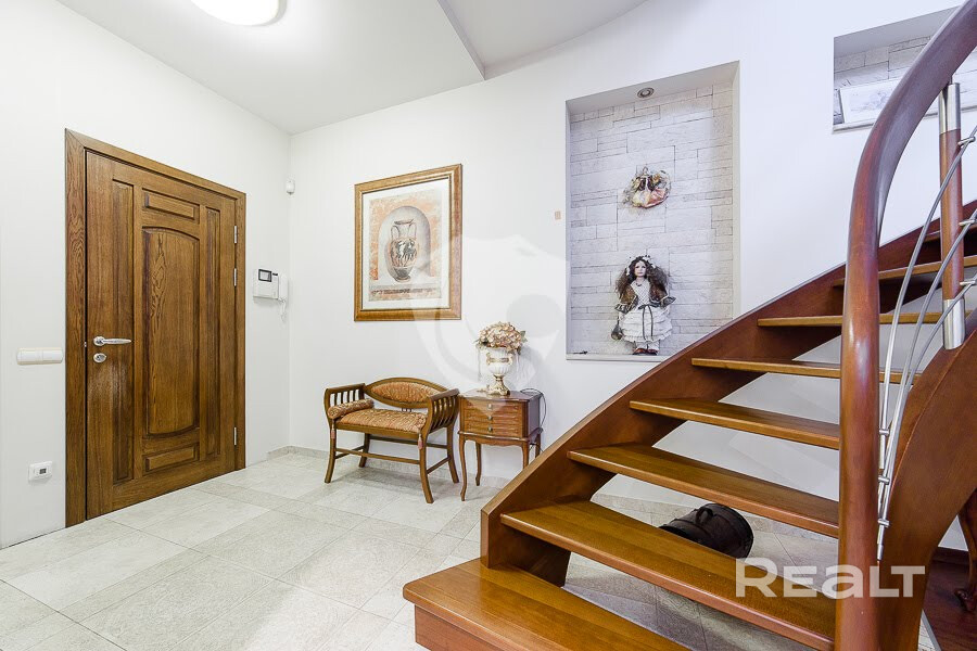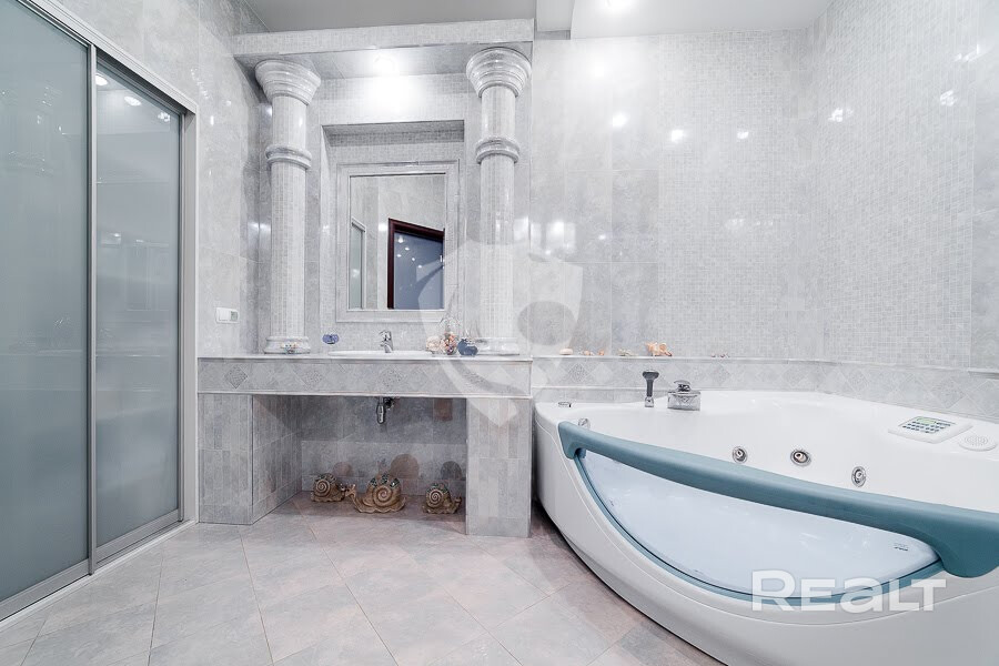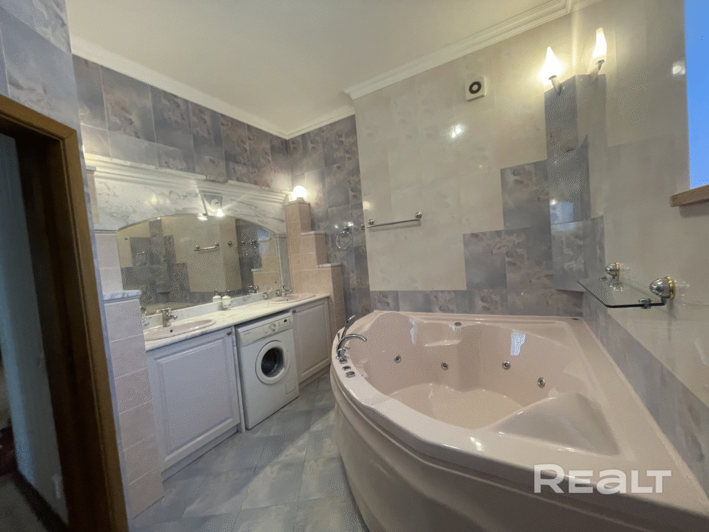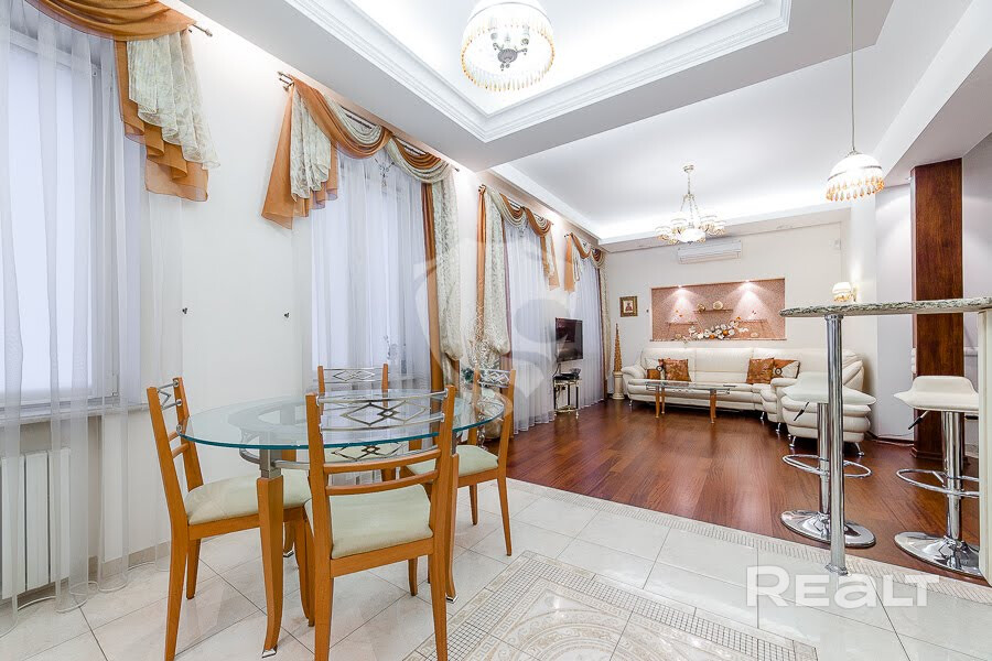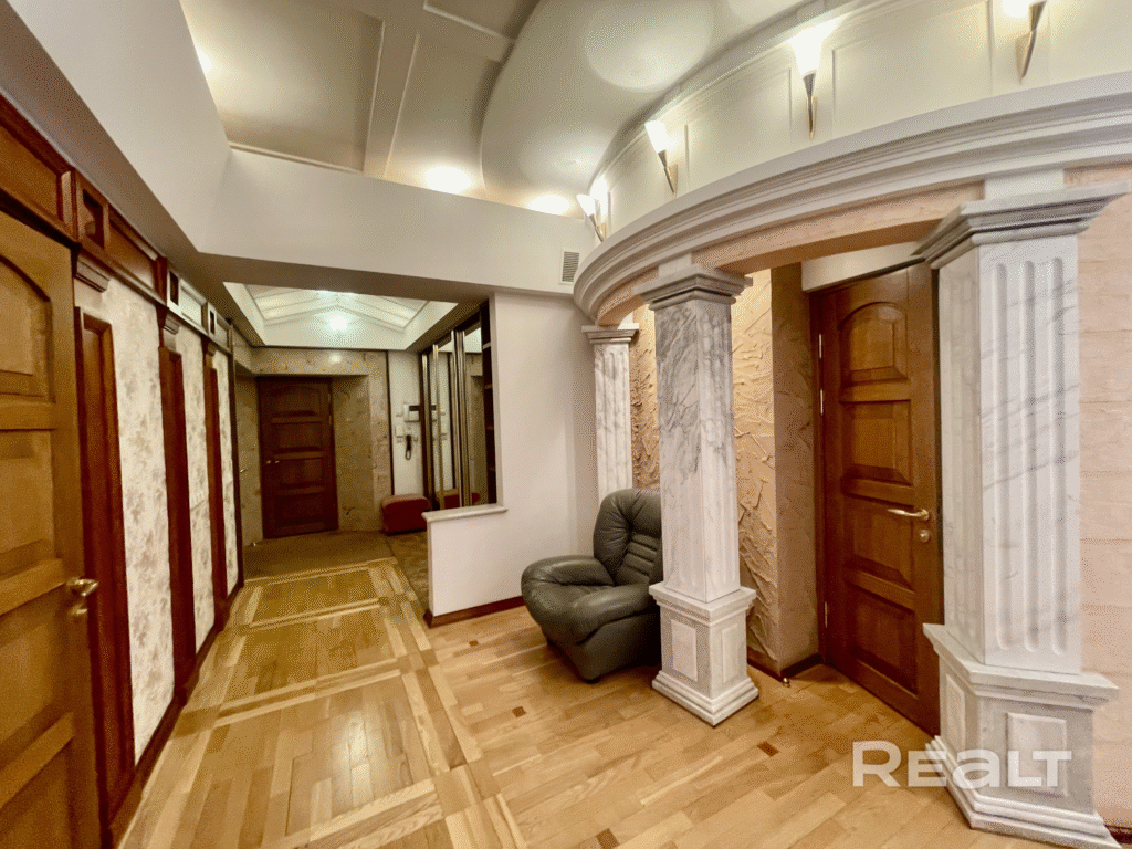 Пятикомнатная квартира, площадью 178 м², расположена на пятом этаже кирпичного дома 2001 года постройки. Жилая площадь составляет 127,6 м². Планировка свободная, предусмотрены балкон и лоджия, два и более санузла. Высота потолков — 3 метра.