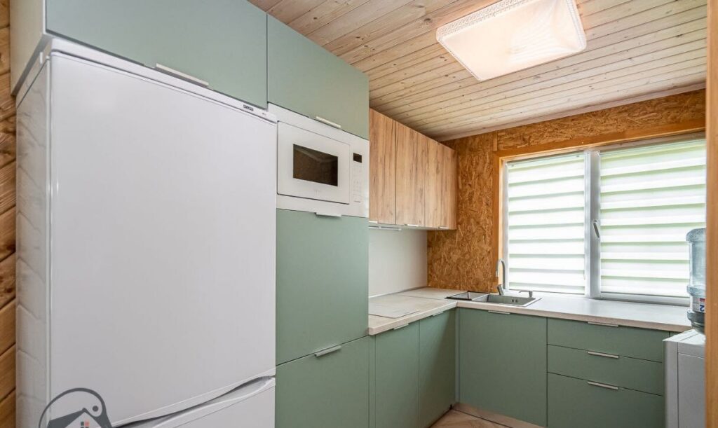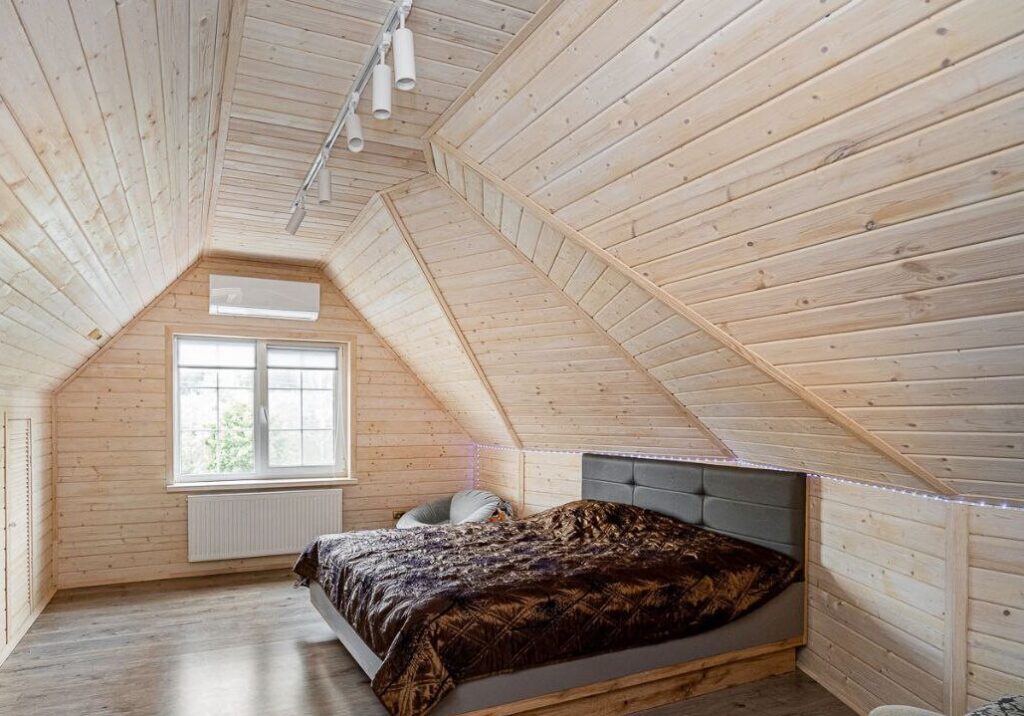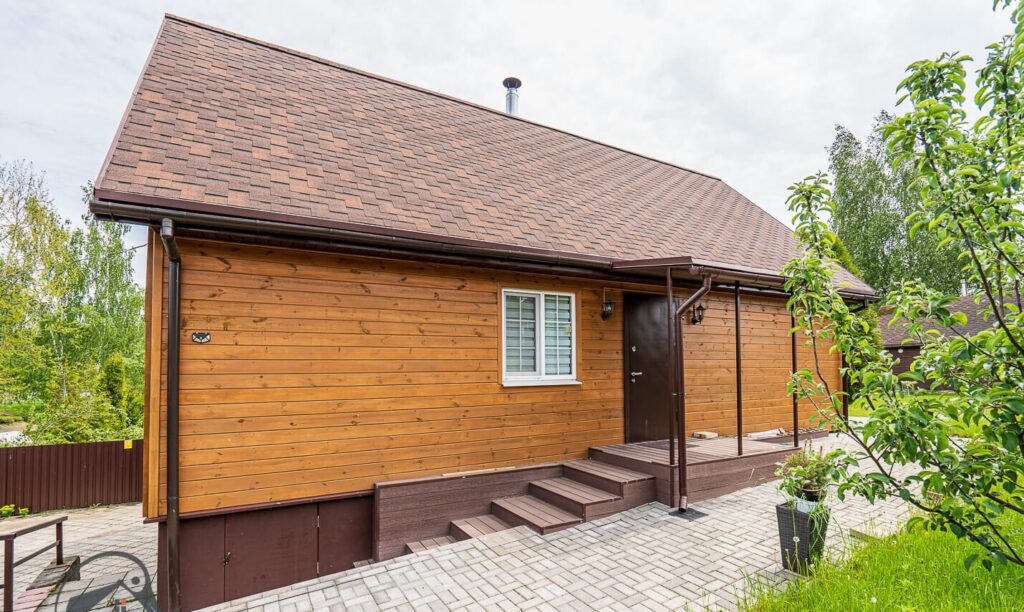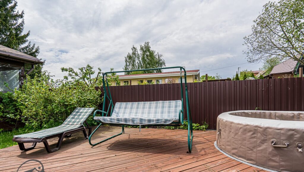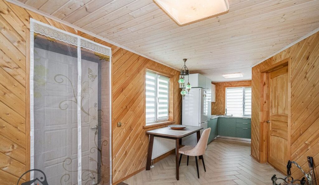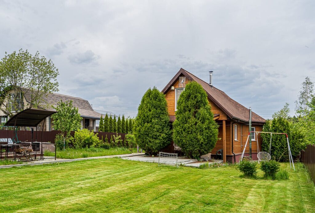 Двухэтажный дом, который был построен и введен в эксплуатацию в 2022 году, имеет интересную и современную форму. Стены коттеджа отделаны деревом, а крыша покрыта ондулином. Общая площадь дачи составляет 140 квадратных метров. Внутреннее пространство включает в себя просторную кухню-гостиную и несколько жилых комнат, которые уже обставлены мебелью и декорированы.