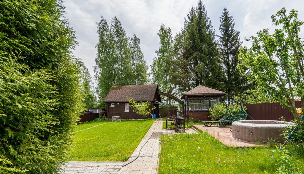 С мансардного этажа открывается великолепный вид на участок, который занимает 7 соток. На территории имеется не только баня с купелью, но и зона для барбекю с беседкой, небольшое футбольное поле и парковка для автомобиля. Участок оформлен с учетом ландшафтного дизайна: земля покрыта газонной травой, а по периметру высажены высокие туи, создающие живописный зеленый забор. Также предусмотрены аккуратные дорожки из тротуарной плитки, которые делают передвижение по участку удобным. Высокий забор из металлопрофиля обеспечивает приватность и безопасность, а автоматические откатные ворота на пульте управления добавляют комфорта в повседневную жизнь.