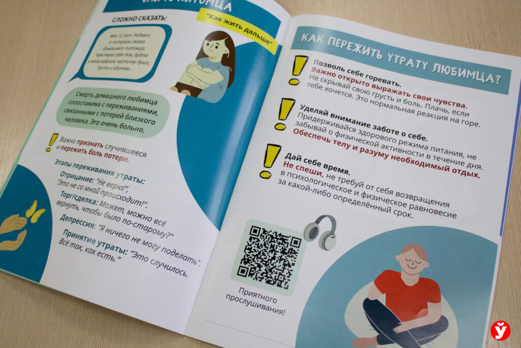 Само по себе пособие «ПодRostok.FM» представляет собой небольшую брошюру формата А4, отпечатанную на добротном глянце. Здесь есть разделы, которые касаются различных проблем. Например, вы можете узнать, какой алгоритм действий будет верным при потере домашнего питомца. Каждая тема интерактивна: внизу страницы есть QR-код, при сканировании которого можно прослушать аудиозапись на заданную тему. Озвучиванием текста занимался профессиональный диктор «Белтелерадиокомпании».