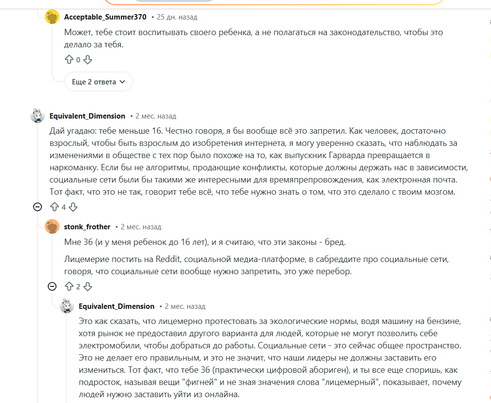 Пользователь Reddit KevinHe92 в обсуждении новостей уточняет: «Извините, но разве несовершеннолетним вообще не стоит сидеть в приложениях для знакомств?». Поддерживает его analog_alison: «На руках многих из этих платформ буквально кровь. Я тоже родитель детей поколения Альфа, которые слишком молоды для социальных сетей, но я презираю перекладывание всей ответственности на родителей. Мы противостоим корпорациям с миллиардными доходами, у которых в рукаве много трюков. Это проигрышная битва, и я поддерживаю законодательство, которое предотвращает/уменьшает воздействие на детей».