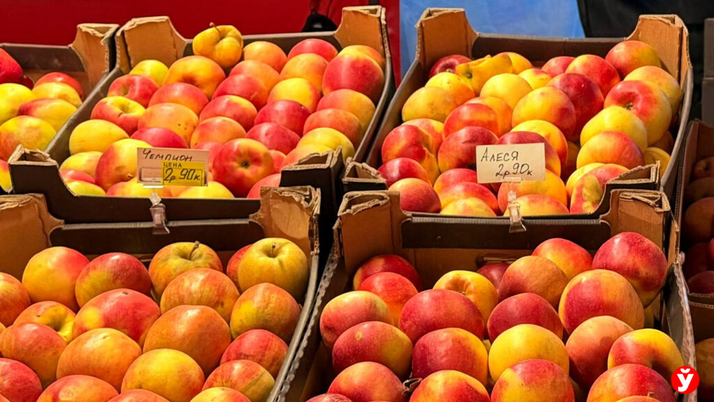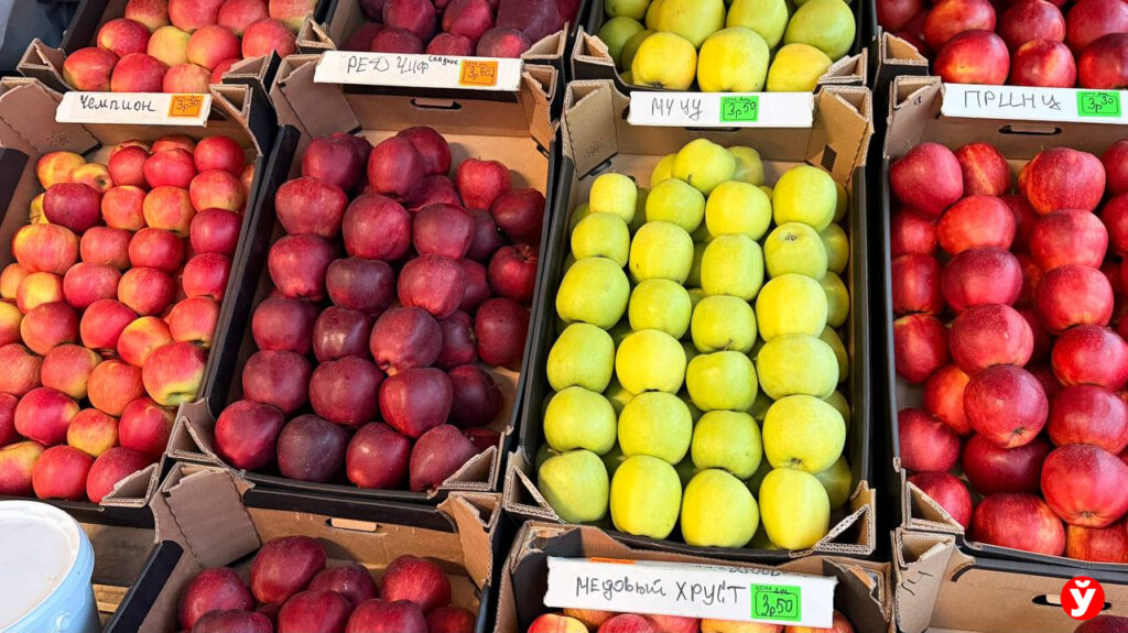 Смело можно сказать, что практически третья часть рынка заполнена яблоками различных сортов. Местные «таборовские» яблоки плотные, ароматные, слегка матовые на поверхности. Самые бюджетные сорта — «Чемпион» и «Алеся» по 2,90 рубля за килограмм, но есть и другие: «Медовый хруст», «Му цу» — 3,50; «Принц» и «Голден» — 3,30 за кило.
