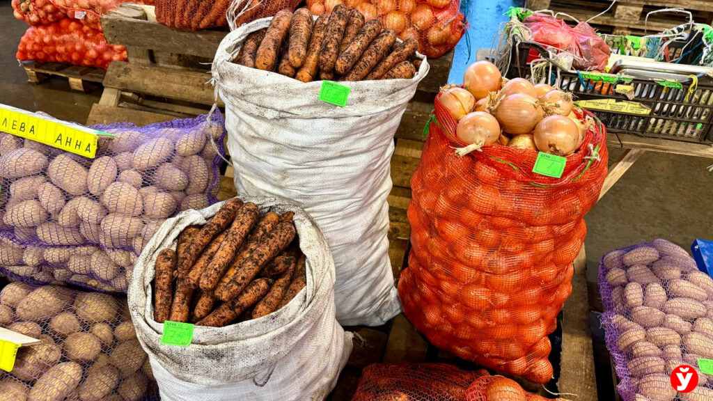 Рядом мешок с такой же бюджетной морковью 65 копеек за более короткие и толстые плоды и 75 за вытянутые. Завершат эту овощную компанию репчатый лук — 1 рубль за кило.
