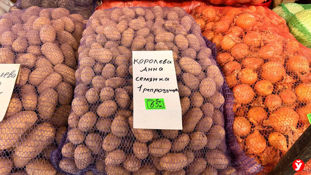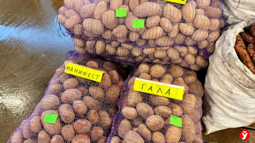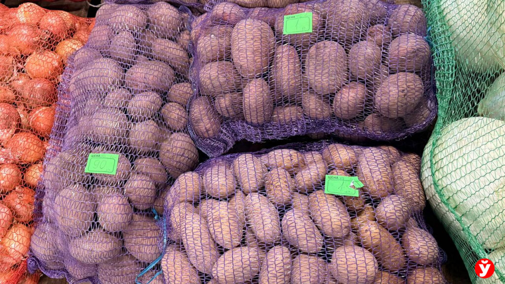 Картофель тут сразу в больших мешках. Цены не разнообразные и остаются в четком диапазоне. Самый дешевый картофель мы нашли за 65 копеек за кило — королева «Анна» семянка, но, к сожалению, плоды очень мелкие. Картофель покрупнее «Манифест» и «Гала» чуть дороже: 80 копеек за килограмм, а еще больше обойдется в 1 рубль за килограмм.