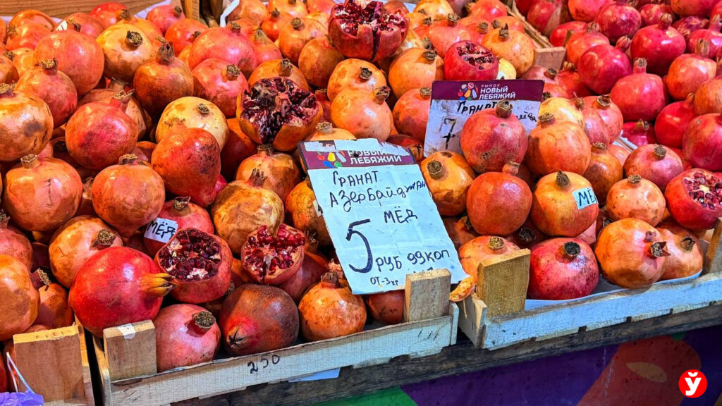 Рядом гранаты — лежат как драгоценности: тёмные, будто маленькие рубины, их специально разрезали, чтобы покупатель видел, какие зерна внутри. Продавцы охотно показывают «начинку», стоимость в среднем от 5,99 до 8 рублей.