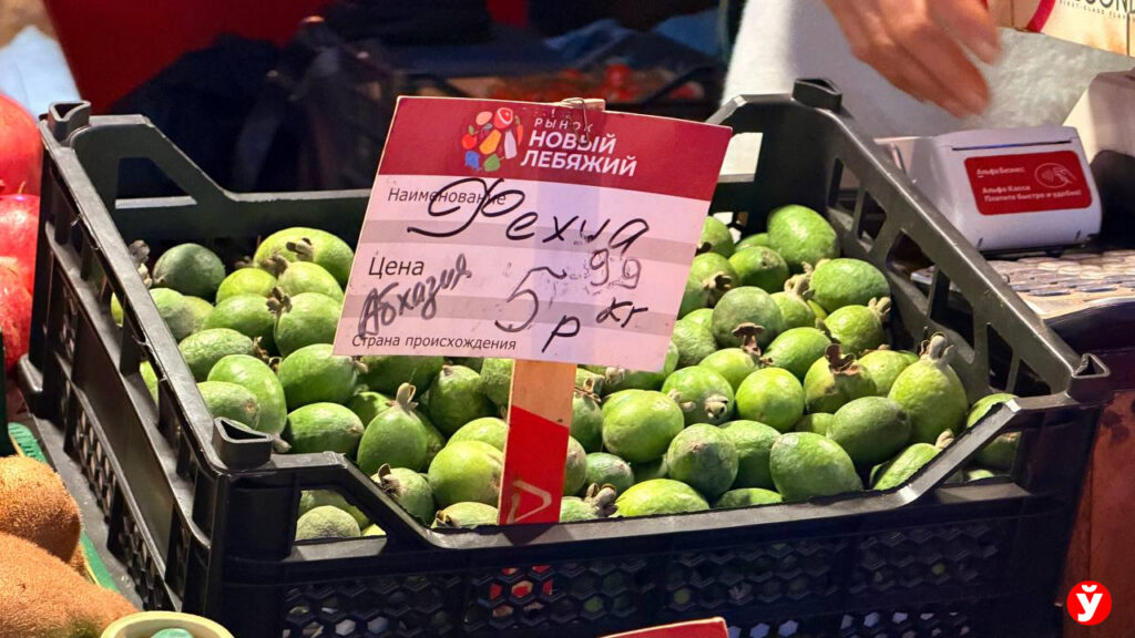 Чуть дальше — зелёные плоды фейхоа, фишка этого фрукта — запах: представьте себе смесь ананаса и земляники вот и получится этот необычный фрукт из Абхазии.