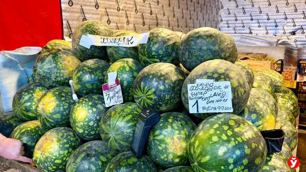 Даже арбуз можно встретить! Правда, их сейчас мало. Пусть он не летний, но вполне съедобный, особенно если хочется чего-то освежающего. Здесь заприметили его только одной палатке. Оптом 1,99 от 100 килограмм, а в розницу уже 3,99, сорт — «Холодок».