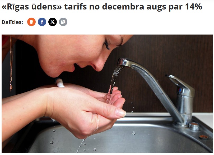Та же логика и с водой. «Rīgas ūdens» — крупнейший поставщик водоснабжения в стране. По официальным данным, в 2024 году тарифы на воду сначала подняли примерно на 2%, затем ещё на 17%, а на конец 2025 года запланирован новый рост на 14,1%.