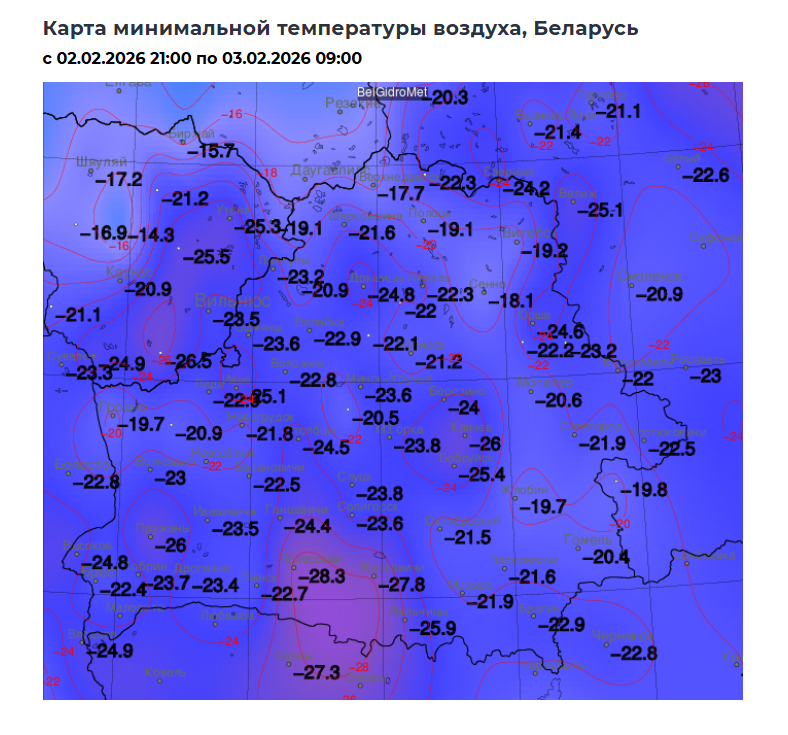 - центральная часть (включая окрестности Минска) — минимальные значения составляли –20–22°C;