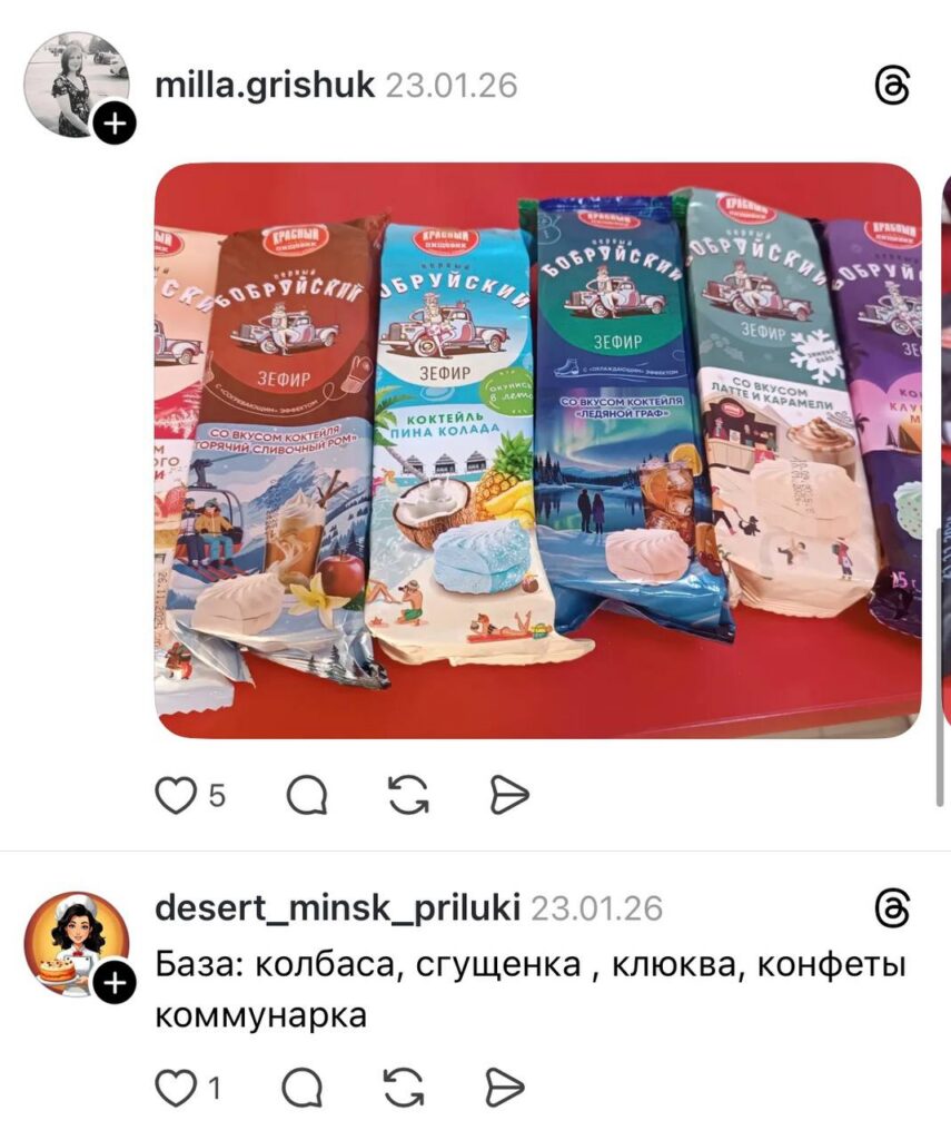 В топе покупок традиционно кондитерские изделия от «Коммунарки» и «Спартака» (особенно горький с солью или начинками), знаменитые «подушечки», а также легендарный бобруйский зефир.