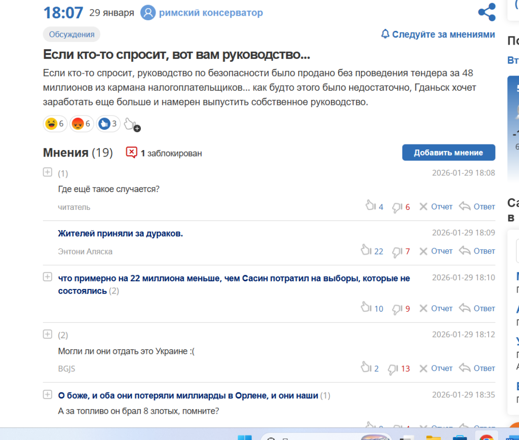На сайте trojmiasto.pl пользователи негодуют (орфография и пунктуация сохранены): «Если кто-то спросит, руководство по безопасности было продано без проведения тендера за 48 миллионов из кармана налогоплательщиков… как будто этого было недостаточно, Гданьск хочет заработать еще больше и намерен выпустить собственное руководство», «Пошаговая инструкция по борьбе с этой пропагандой. Достаньте инструкцию по технике безопасности из коробки и немедленно выбросьте ее в мусорное ведро».