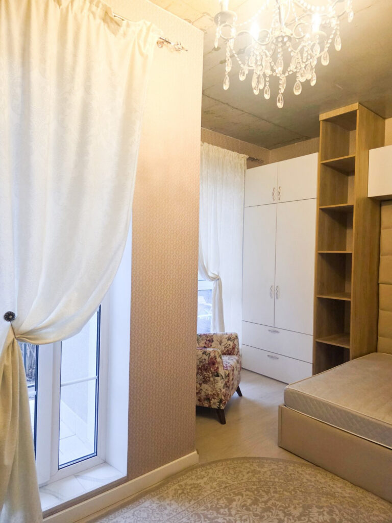 Вторая жилая комната обустроена под спальню. Там стоит двухспальная кровать, шкафы и комоды для хранения вещей. Также у квартиры имеется своя личная терраса с выходом.