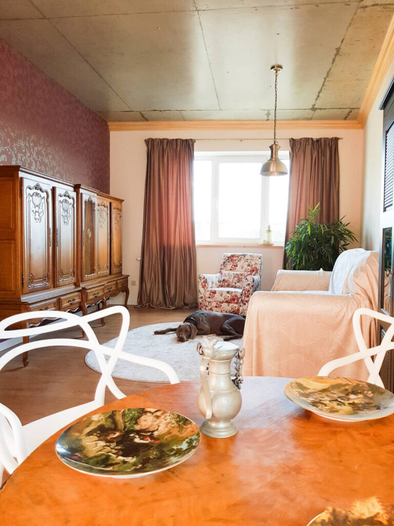 Первая жилая комната обустроена под гостиную и частично столовую. Там стоит гарнитур, диван и стол со стульями. В шаговой доступности — кухня в красно-белых тонах, где стоят холодильник, плита и другая техника.