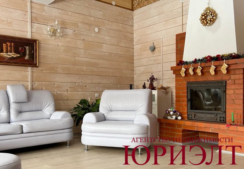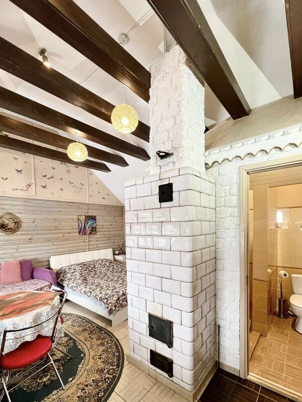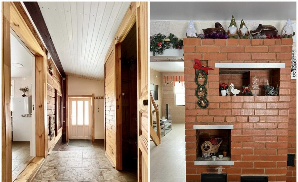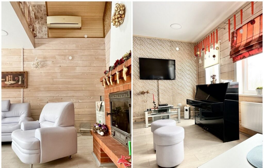На первом этаже дома располагается кухня, полностью укомплектованная бытовой техникой, включая индукционную плиту и посудомоечную машину. Есть и просторный зал с атмосферным камином. Также на этом уровне находится раздельный санузел.