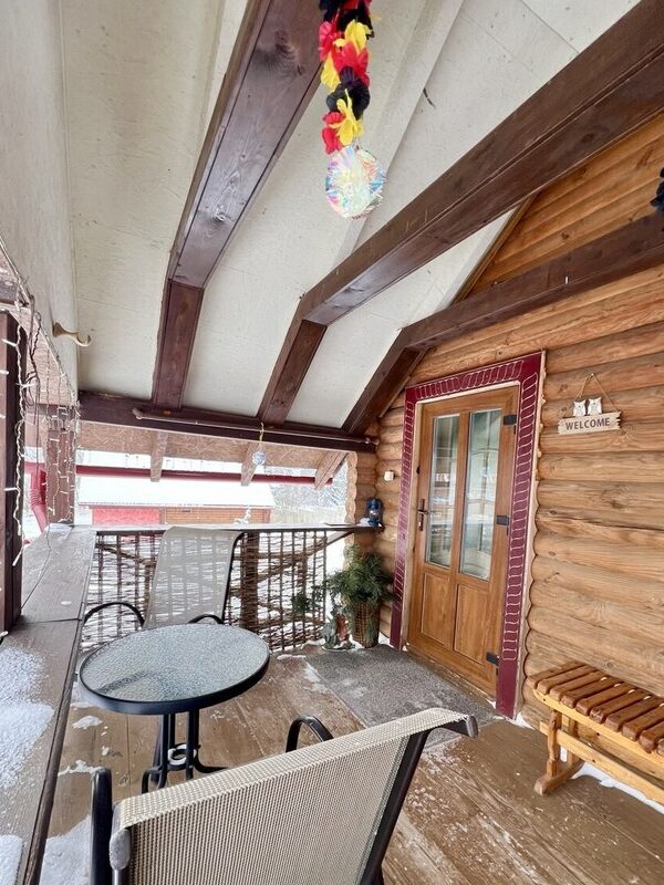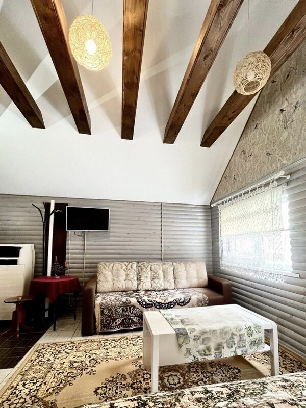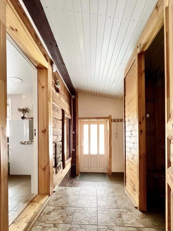 На территории находятся три капитальных дома, построенные в 2018 году. Основной дом с мансардой имеет площадь 64 квадратных метра. Его внешние стены и отделка выполнены из натуральных древесных материалов. Полы здесь уложены из натуральной доски и плитки, а крыша покрыта металлочерепицей. Внутри основного дома предусмотрены все удобства: оборудована печь-камин, есть электроотопление, водонагреватель и кондиционер.