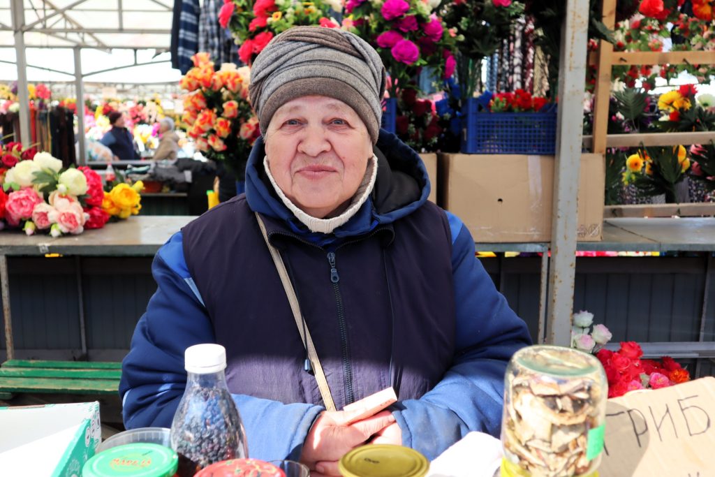 Эксперта зовут Клавдия Владимировна. Она живёт и растит клубнику в деревне Вязовец, но пока на рынке торгует своими закатками.