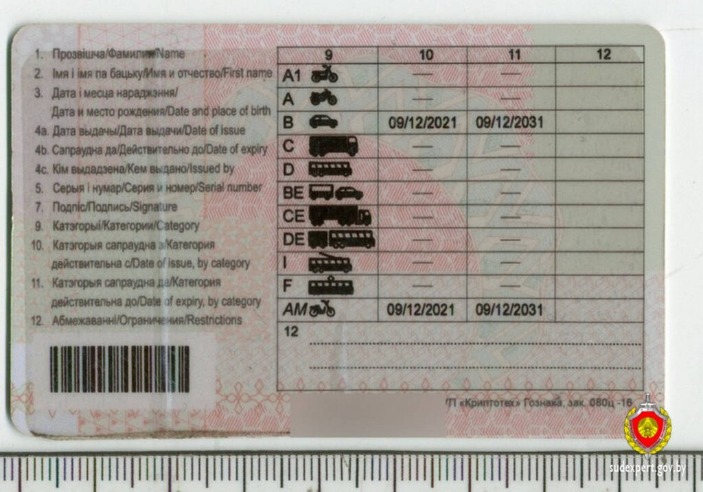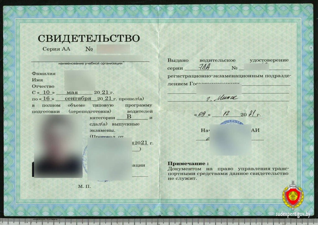 Эксперты установили, что удостоверение изготовлено не предприятием, осуществляющим производство продукции данного вида. Все изображения лицевой и оборотной сторон бланка документа, включая изображение отличительного знака Республики Беларусь «BY» и номер бланка, выполнены способом струйной печати. Элементы защиты имитированы различными способами.