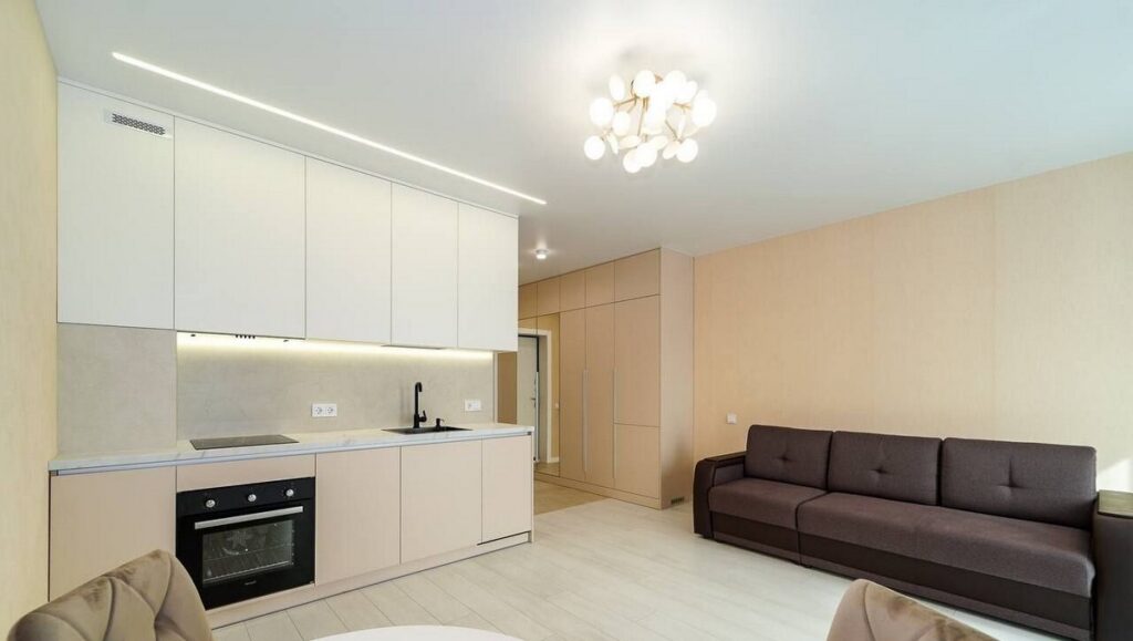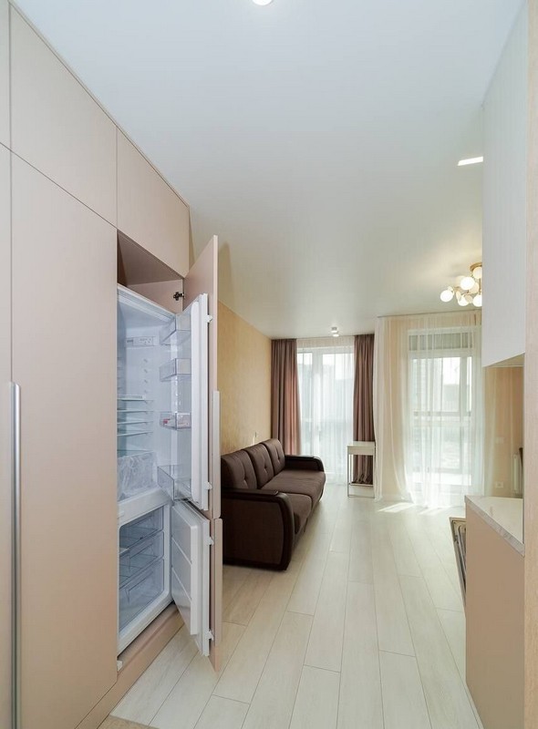 В квартире имеется раскладной удобный диван с нишей, вместительный шкаф, стол, мягкие стулья. В кухне — встроенный холодильник, духовой шкаф, варочная панель, вытяжка и посудомойка.