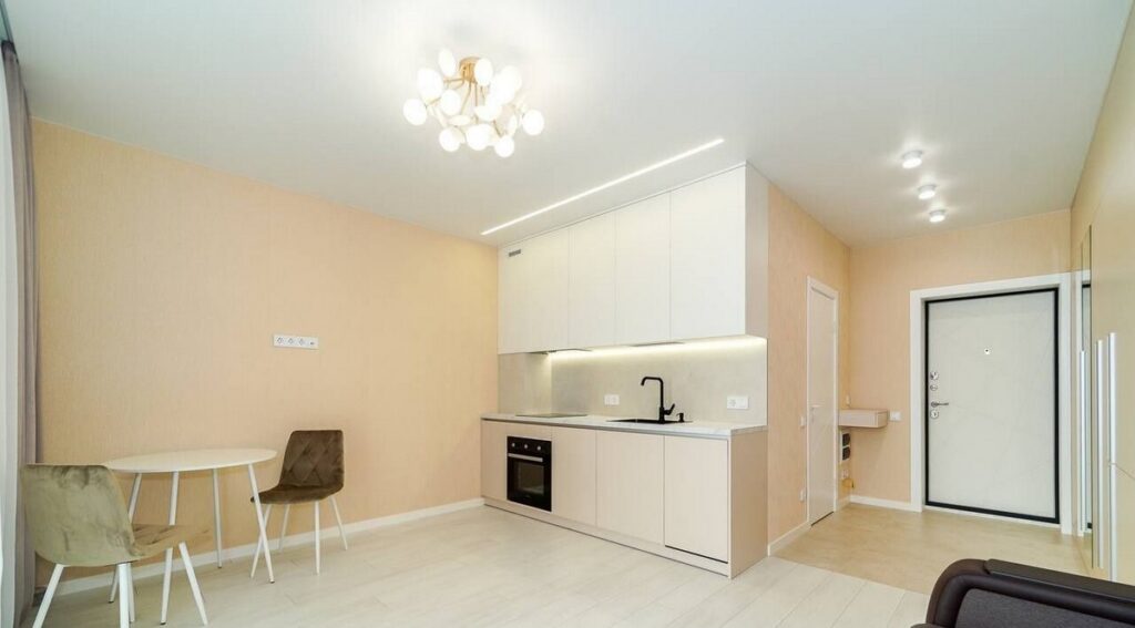 Нашли симпатичную дизайнерскую однушку за среднюю цену на рынке арендного жилья. Цветовое оформление точно понравится «бежевым мамам» и поклонникам минимализма в пастельных оттенках.