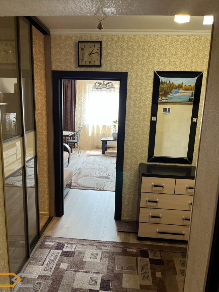 В объявлении сказано, что в однушке сделан хороший свежий ремонт. Жилая комната достаточно просторная и включает в себя диван, шкафы для хранения вещей, рабочую зону со столом и телевизор.