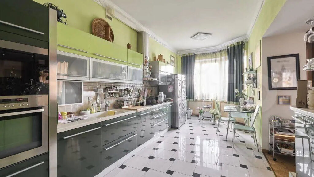 Кухня-гостиная — наиболее современное на момент ремонта помещение в оливково-изумрудной гамме с черно-белым полом и барной стойкой.