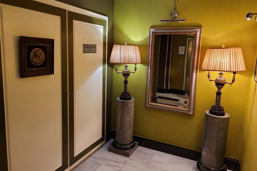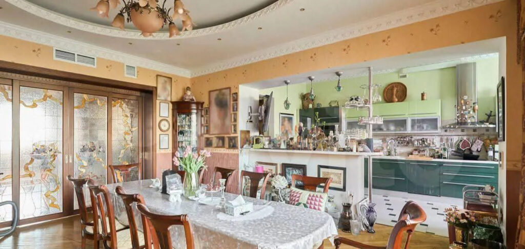 Квартира, пережившая капитальный ремонт в 2000-х с использованием дорогих материалов, демонстрирует характерный для того времени интерьер с элементами избыточной роскоши: бархатные шторы, диван с бахромой, накладные потолки, стеклянные двери с витражами. Повсюду уложен натуральный паркет. Особенно выделяется просторный овальный холл с сервантами.
