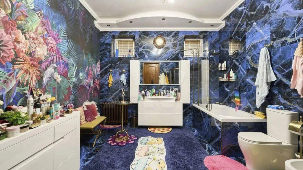 Ванная комната имеет наиболее перегруженный декор: сочетание темно-синей плитки и ярких фотообоев с цветами, а также премиальная сантехника.