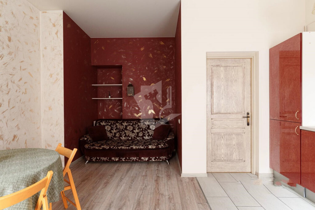 В просторной спальне стоит вместительная кровать, шкаф и телевизор. В кухне-гостиной, помимо стандартного набора бытовой техники (холодильник, плита, СВЧ-печь), также есть телевизор, небольшой обеденный стол и диван в отделенном двумя стенками пространстве. Кроме этого, из помещения есть выход на небольшую незастекленную лоджию.
