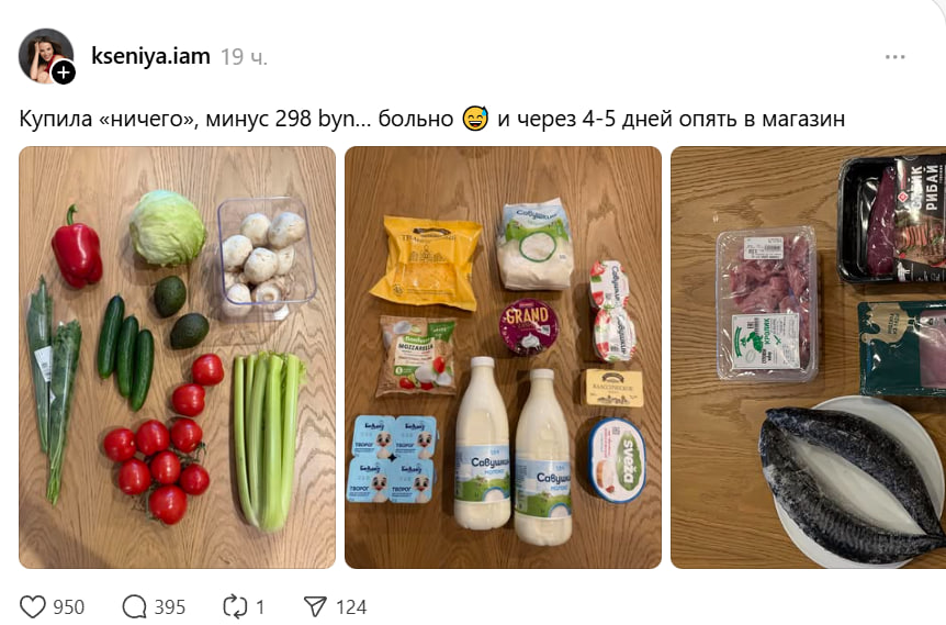 «Купила «ничего», минус 298 byn… больно. И через 4-5 дней опять в магазин», – пожаловалась она в своем аккаунте, опубликовав фото продуктовой корзины.