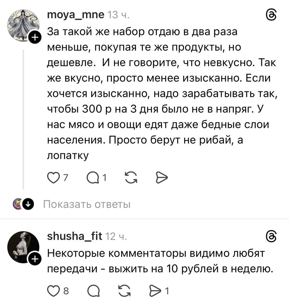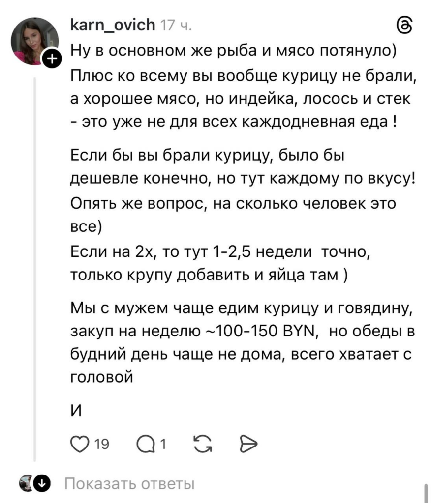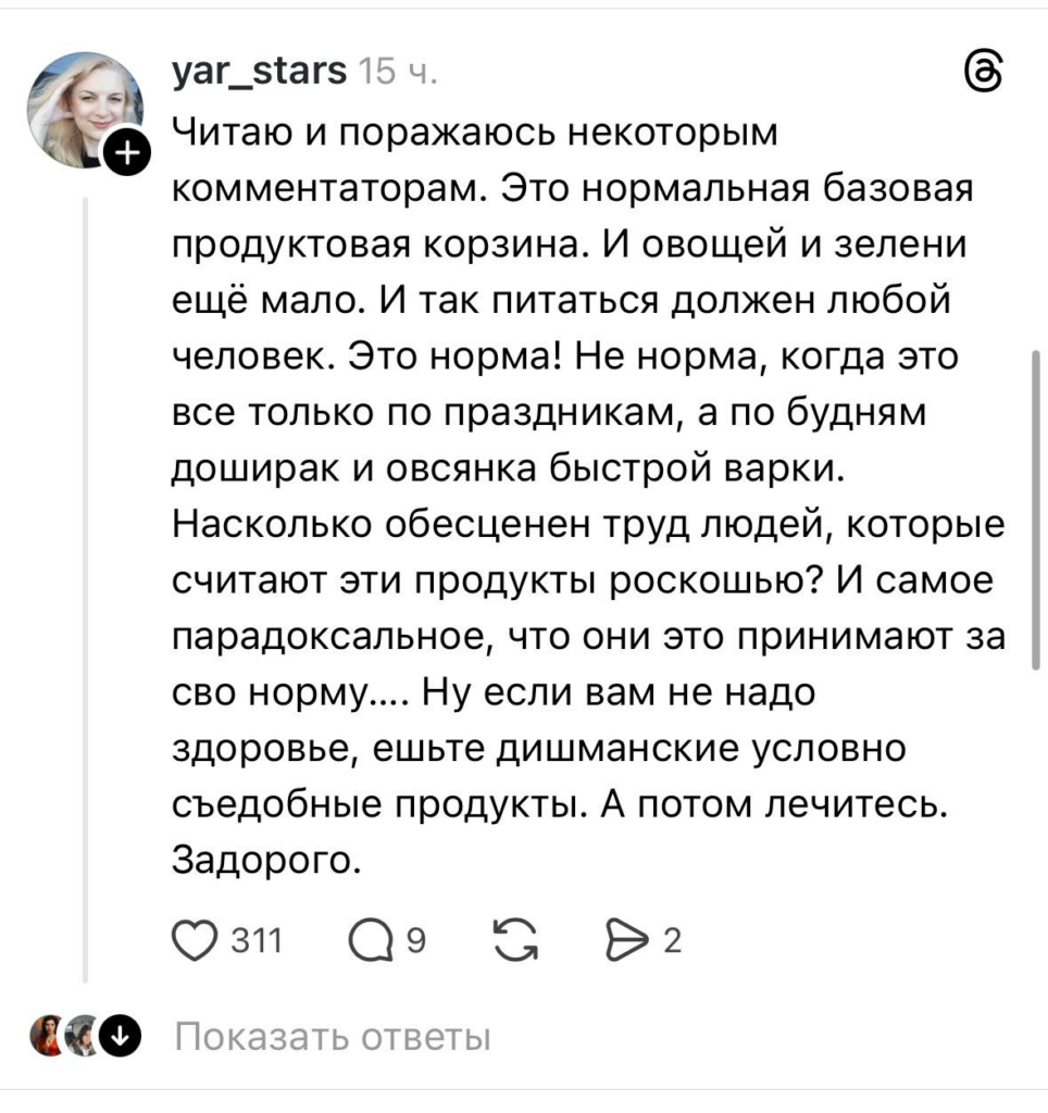«Поражаюсь взрослым людям, которые пишут, что всё это можно заменить. Это базовый минимум, как должен питаться любой человек, чтобы быть здоровым, получать достаточное количество питательных веществ, различных микроэлементов, витаминов и тд. Дело в другом, что не всем платят достойную зарплату», – убеждена y.u.l.i.a_88.