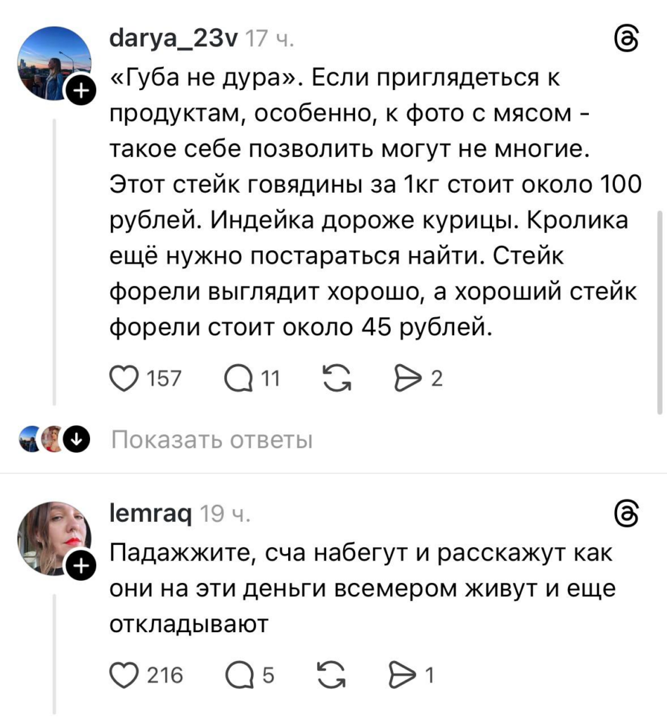 «Повыеживалась? Замени кроликов, стейки на вырезку говяжью, курицу, индейку в другом виде (набор для супа, фарш и т.д.) и будешь нормально питаться, если готовить умеешь, а похоже, что нет. Для хайпа написала. Один поход в магазин в среднем 40 рублей. Умножай на 4-5, как ты пишешь 160-200. Вот и экономия», – с ноткой злости выразила свое мнение elena_lazuta.
