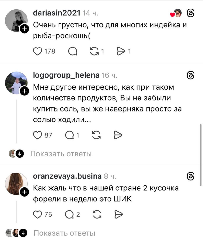 Третьи задаются вопросом, за какой промежуток времени автор планирует съесть купленное – мол, на неделю этого будет мало. Четвертые и вовсе искренне сочувствуют, делясь своими историями о том, как поход в магазин за «хлебом и молоком» заканчивается тратой внушительных сумм.