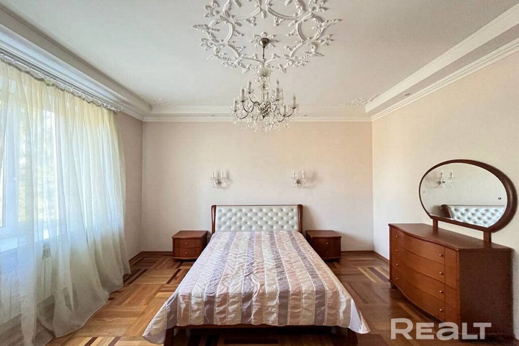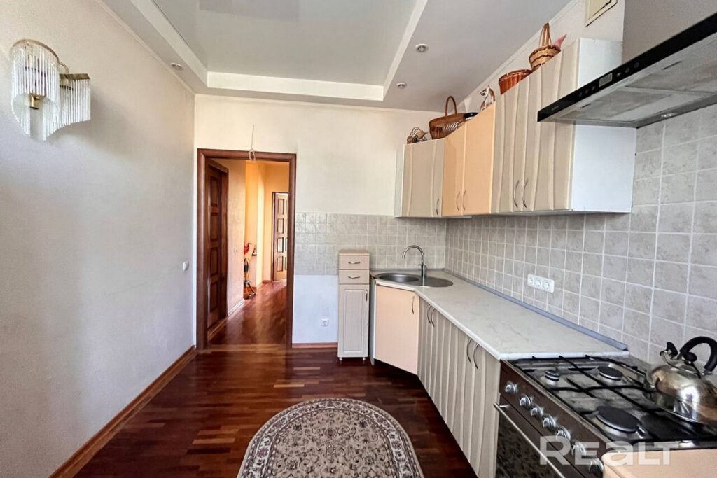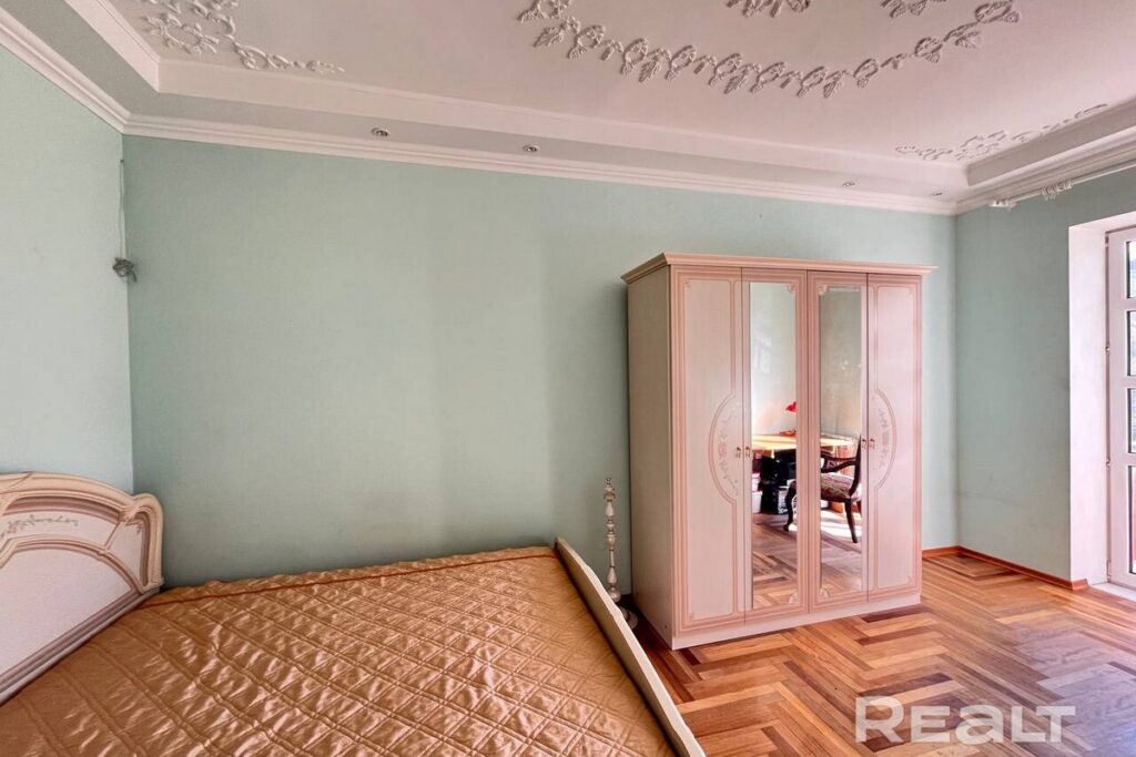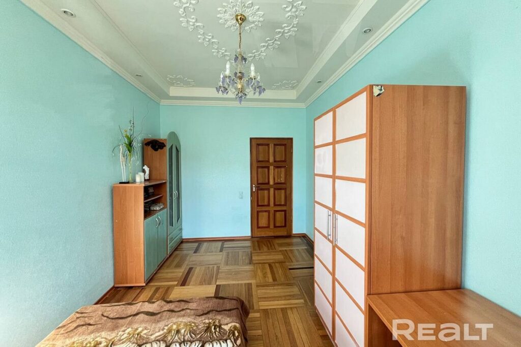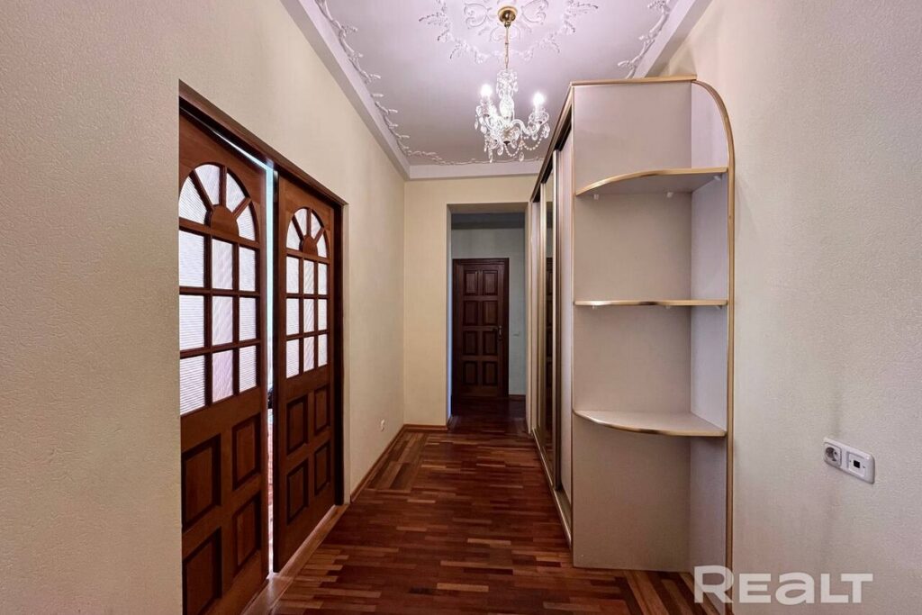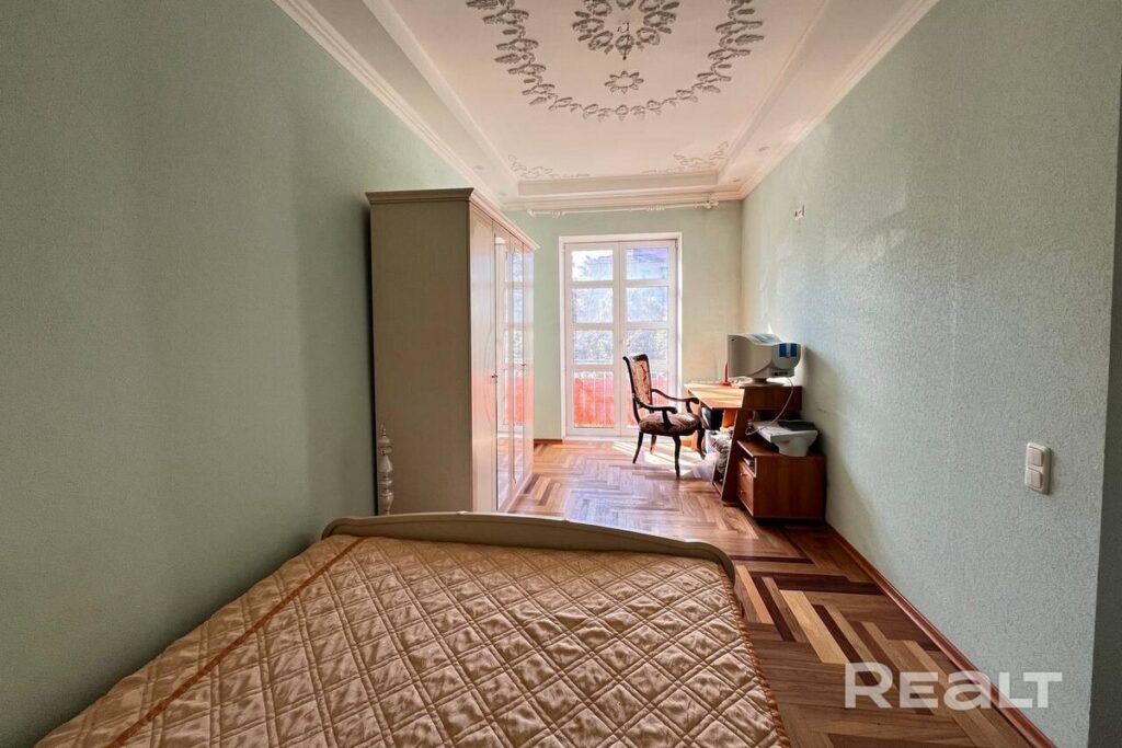 Квартира, расположенная на втором этаже сталинки по адресу проспект Независимости, 111, имеет площадь 97,5 квадратных метров и включает в себя четыре комнаты. Дом, в котором она находится, прошел капитальный ремонт.